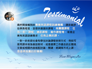 偶然間接觸到的專業英語課程訓練機構,課前會評估學員程度,並提供適當的課程。有團體課程,也有一對一課程、遠距課程、寫作課程等。若是企業有英語訓練需求,也有企業的課。 一對一的老師也會和學生討論課程安排方式,例如可使用課本做為會話教材,或是選擇工作適合的主題挑文章或相關內容搭配討論、閱讀、朗讀等方式上課。 是值得推薦的好機構!- Wayne Lee